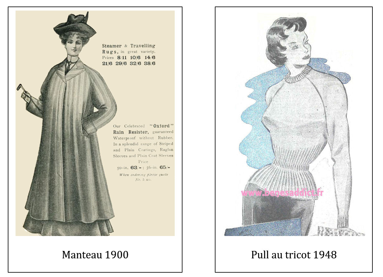 A propos de … raglan : Les manches raglan se prolongent sur les épaules, qu’elles recouvrent jusqu’à l’encolure. Ce terme provient de Lord Raglan (1788-1855) qui perdit son bras droit à la bataille de Waterloo. Afin de pouvoir s’habiller seul il inventa une manche cousue au niveau du col. Ce type de manches connut le succès, tout d’abord sur les manteaux. Puis la manche raglan se développera avec la mode du pull au tricot comme vêtement de dessus, dans les années 1930.