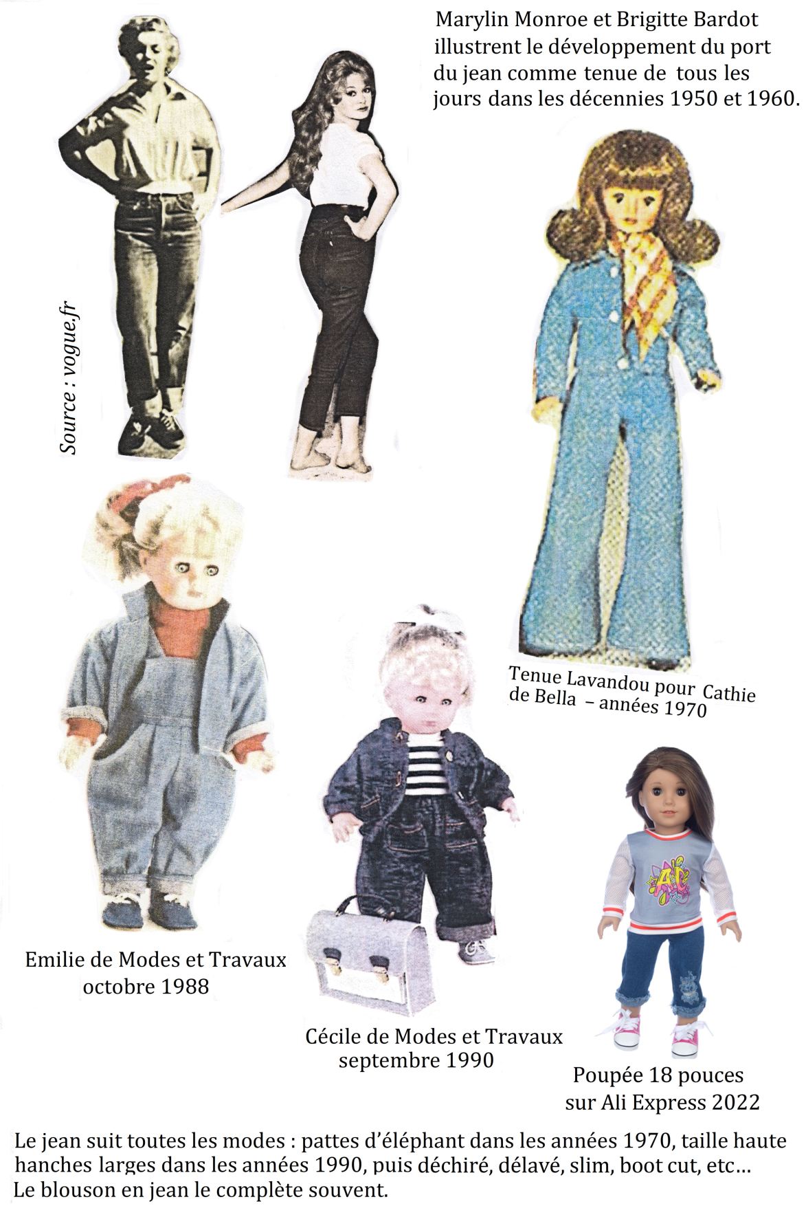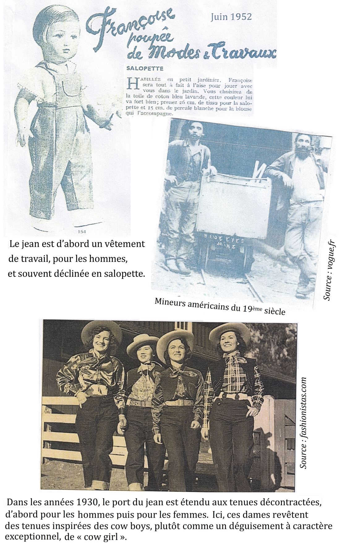 A propos … du jean : Ce pantalon est inventé comme vêtement de travail dans l’Amérique de la fin du 19ème siècle. Comme tout pantalon, il est alors réservé aux hommes. L’évolution de la société ne pouvait que profiter au jean. L’usage des tenues décontractées se développent avec les loisirs ; les femmes s’habillent comme les hommes ; les jeunes veulent se démarquer par leur habillement.