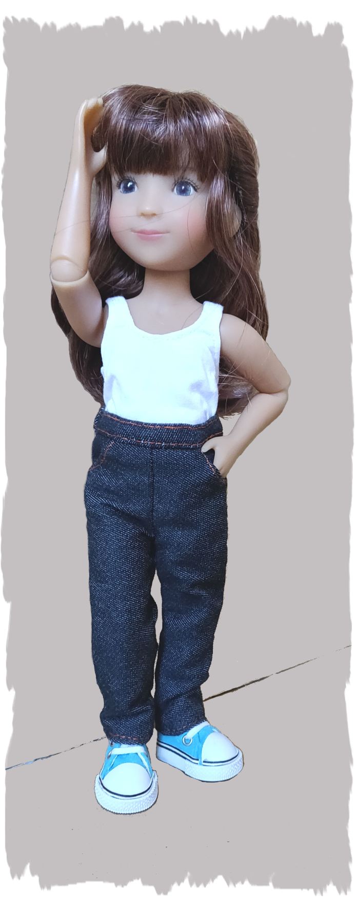 4)Assembler jambes dos et devant par les coutures extérieures. Replier les coutures vers l’arrière, surpiquer sur l’endroit avec le fil orange. Assembler les deux parties du pantalon par la couture milieu devant. Piquer la ceinture. Replier les surplus vers le haut et surpiquer en orange. Fermer le haut du jean en piquant la couture du milieu dos. Plier la ceinture en deux, faire un rempli et fixer par un point d’ourlet, en laissant un passage pour glisser un élastique. Surpiquer le bord haut de la ceinture en orange.