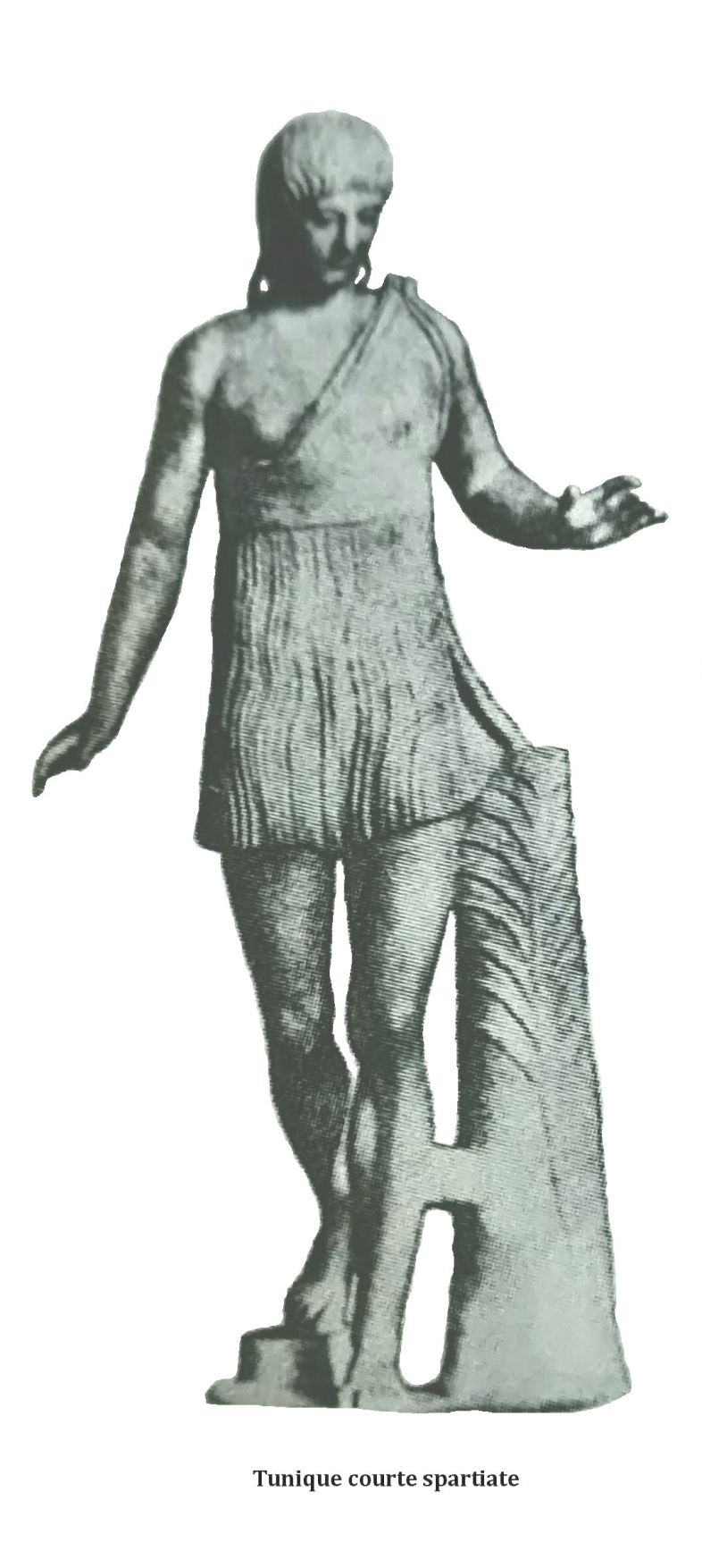 C’est un modèle spartiate à jupe plissée, tel que représenté dans la sculpture du début d’article. Le haut est plat, bordé d’un ruban torsadé. Il est assez court, il s’arrête au-dessus de la taille et du nombril.