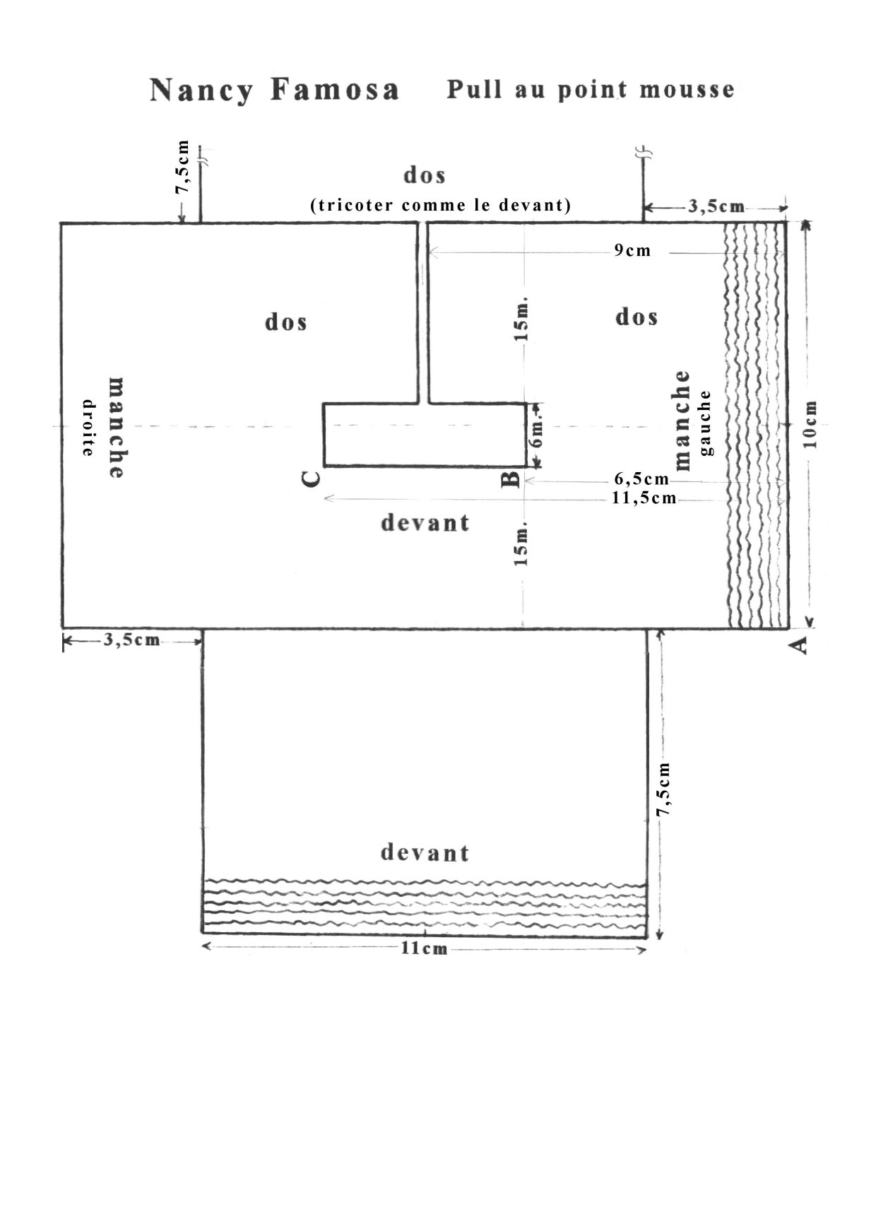 Exécution (se reporter aussi au schéma ci-dessous) : on commence au point A, par le bas de la manche gauche. Monter 36 m. Tricoter tout droit. A 6,5 cm de hauteur totale, en partant de la gauche de l’ouvrage, tricoter 15 m ; retourner l’ouvrage. Laisser les 21 m. restantes en attente. Revenir sur les 15 m., tricoter ces 15 m. jusqu’à avoir 5 cm, soit 11,5 cm de hauteur totale. A ce point, laisser ces m. en attente, casser le fil. Reprendre les 21 m. laissées en attente de l’autre côté. Rabattre les 6 m. centrales, continuer sur les 15 m. restantes. A 9 cm de hauteur totale, on arrive à la fente dos, rabattre les 15 m. Casser le fil.